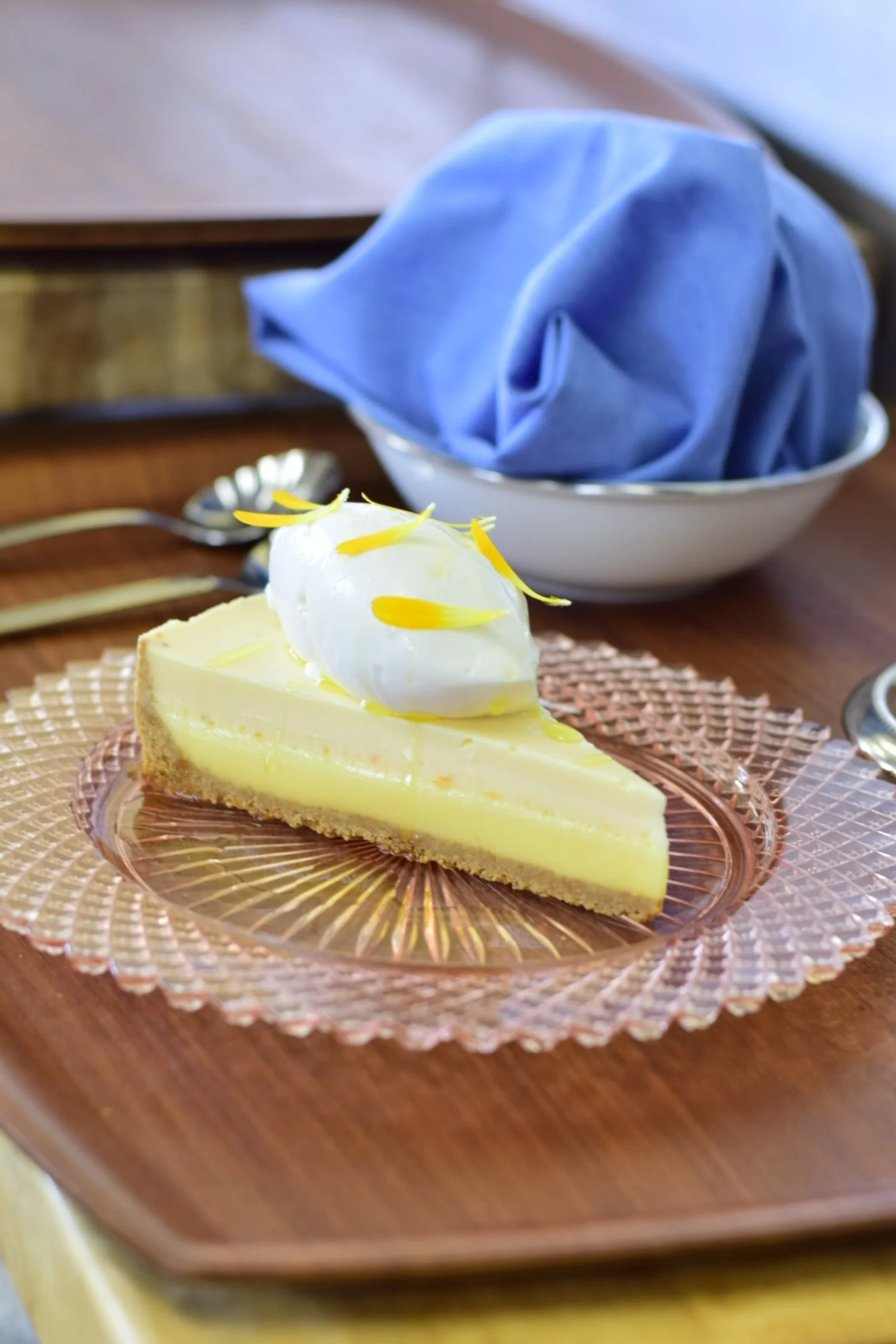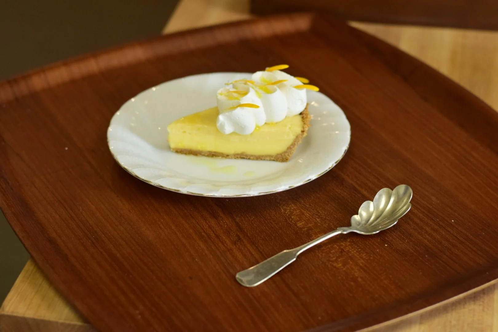 A slice of lemon tart with whipped cream and lemon zest on a white plate, placed on a wooden tray with a decorative spoon.