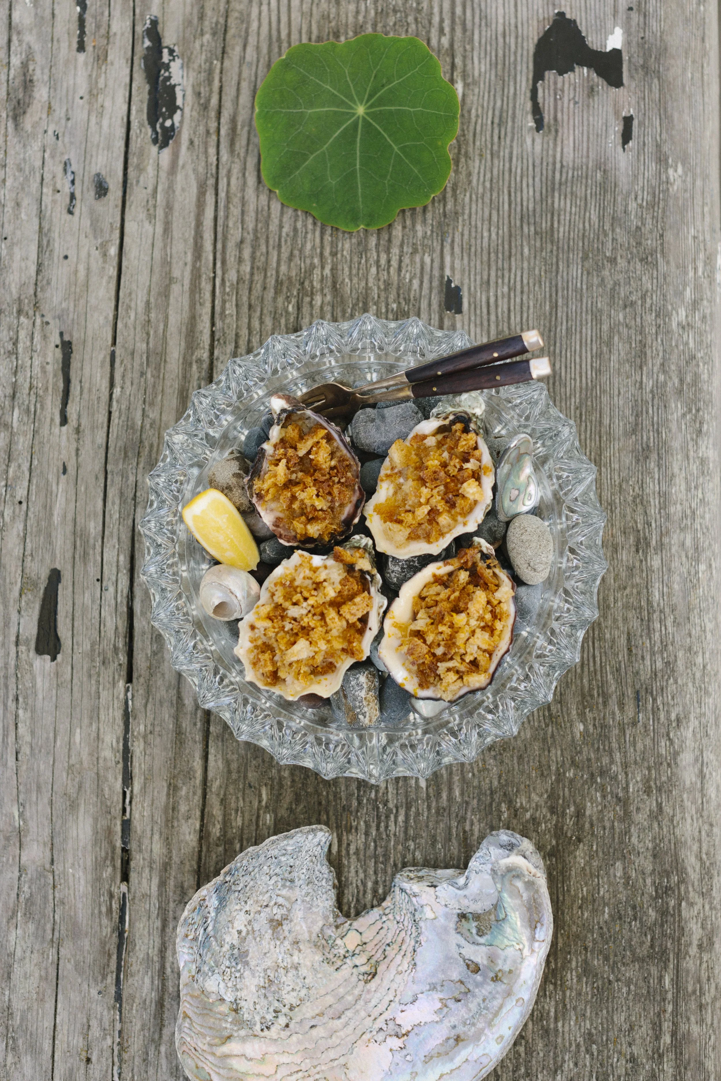 A glass dish with four stuffed shells topped with bread crumbs, accompanied by a lemon wedge, placed on a wooden surface with seashells and a green leaf nearby.
