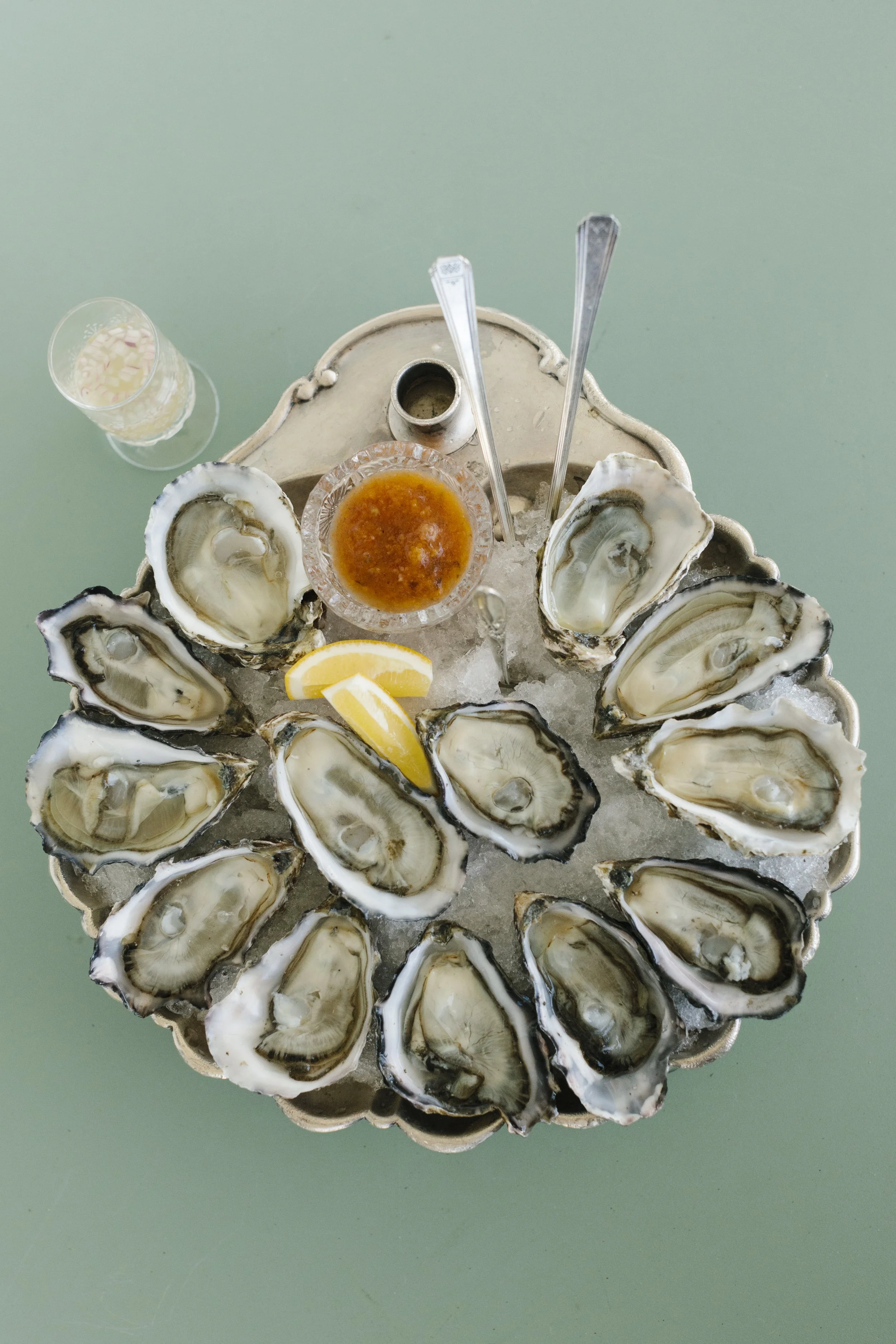 A tray of fresh oysters on ice with lemon wedges, cocktail sauce, and a small shot of liquor, served on a light green table.
