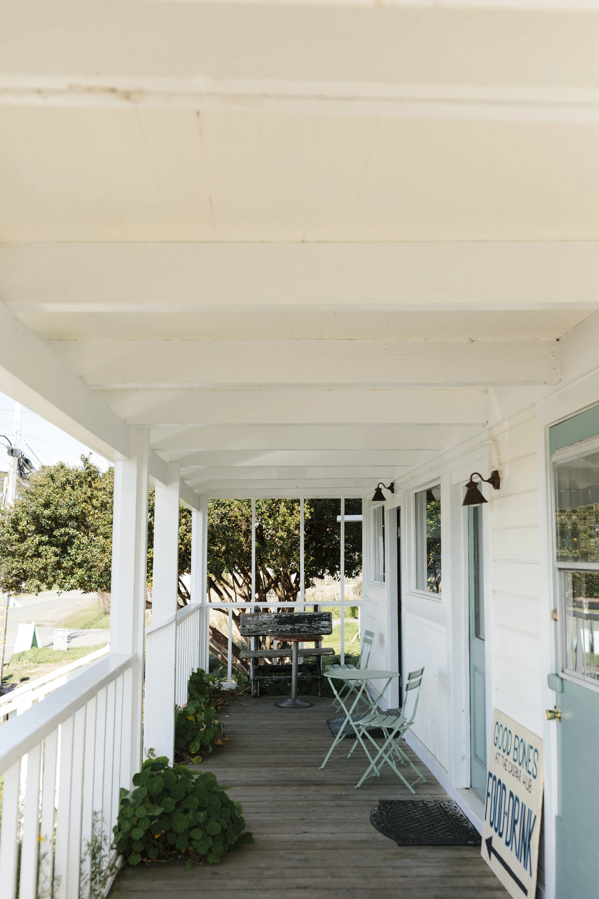 Covered porch of a white building with a small round table, two light green folding chairs, and a weathered black bench. Green bushes along the edge and a sign on the door saying 'Good Bones' and 'Four Paws' with an arrow.