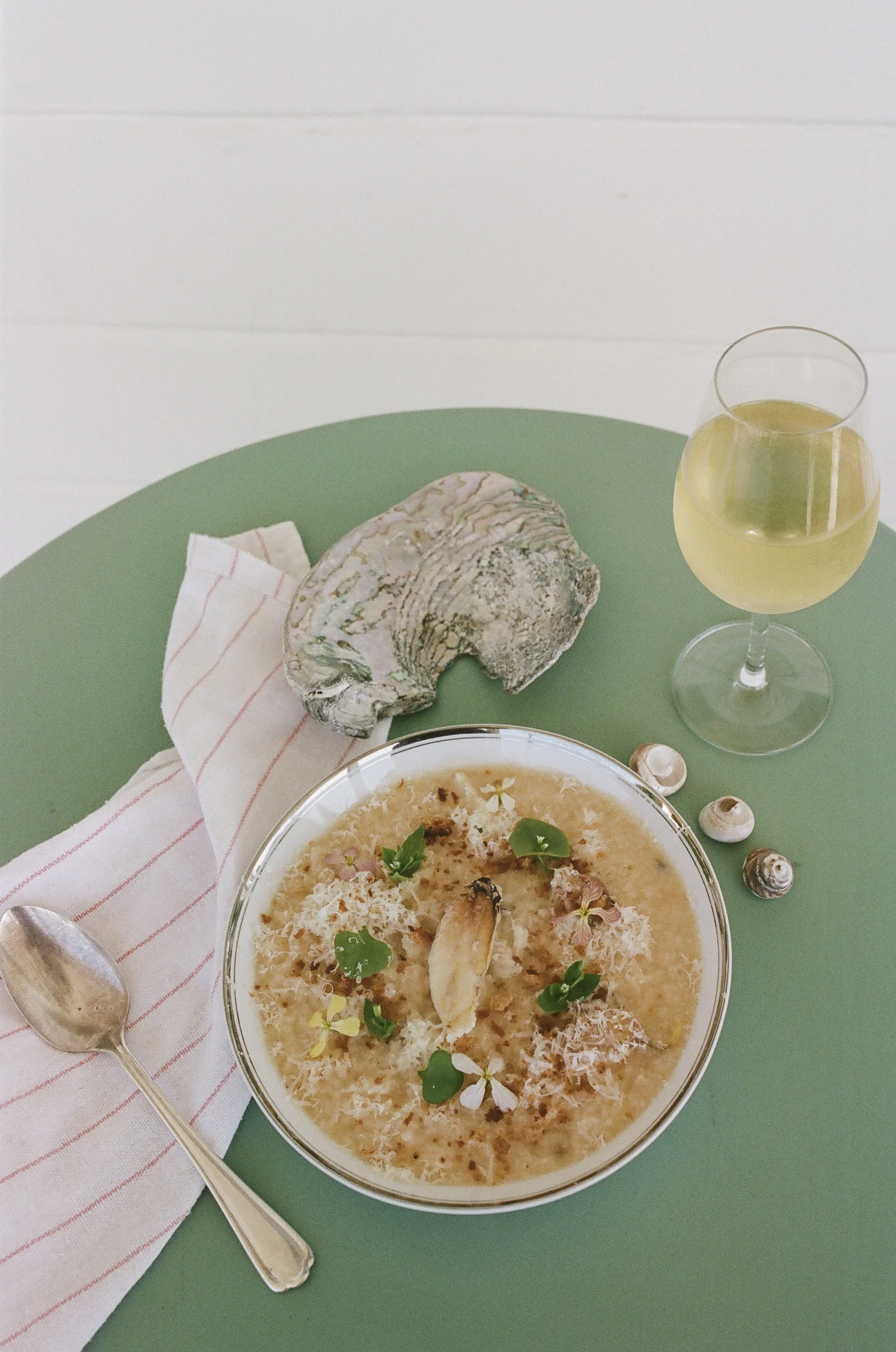 A bowl of creamy seafood soup garnished with herbs and flowers, a shell, a glass of white wine, a striped napkin, and seashells on a green table.