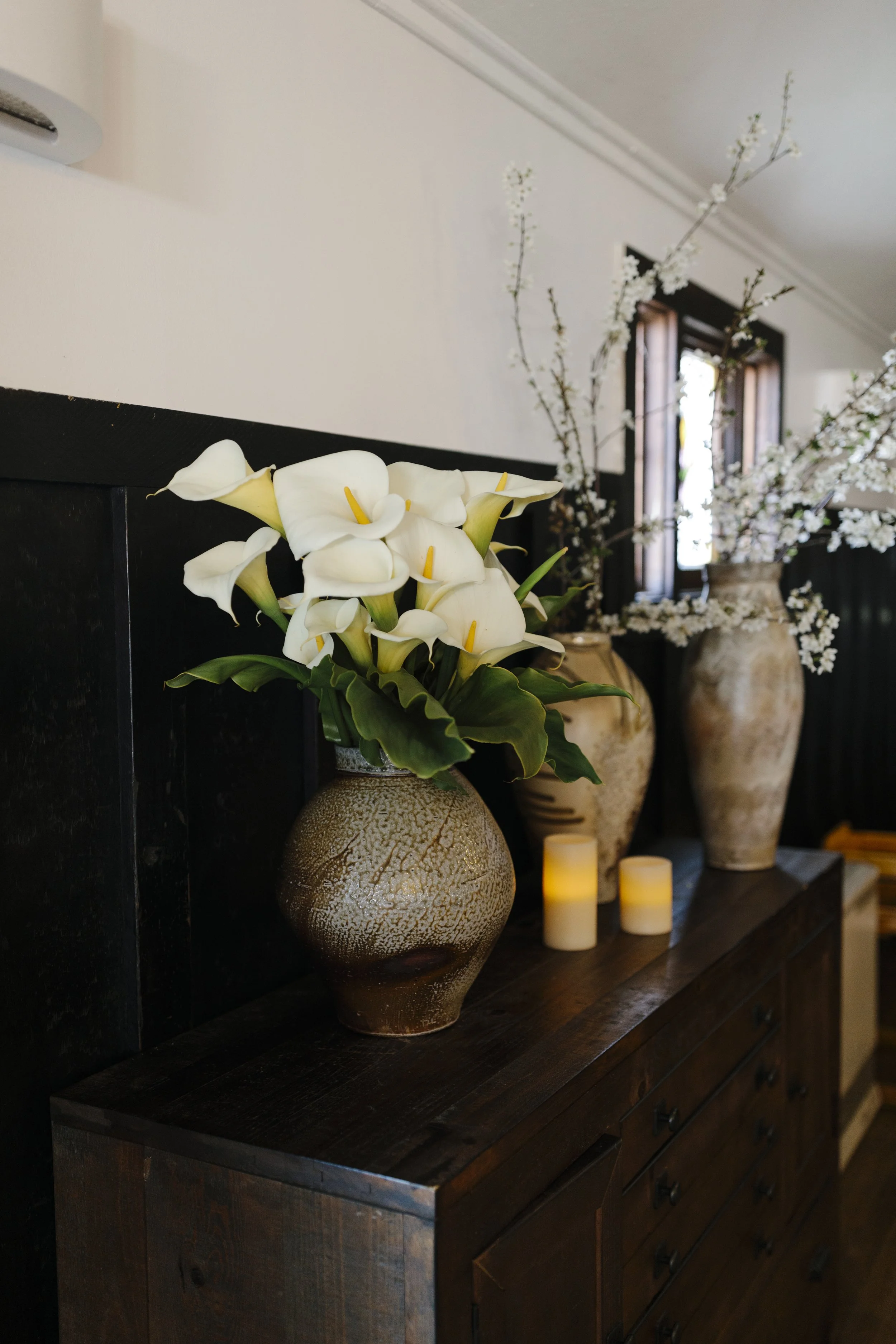 Decorative vase with white calla lilies and green leaves on a dark wooden sideboard, with candles and other vases with flowers in the background.