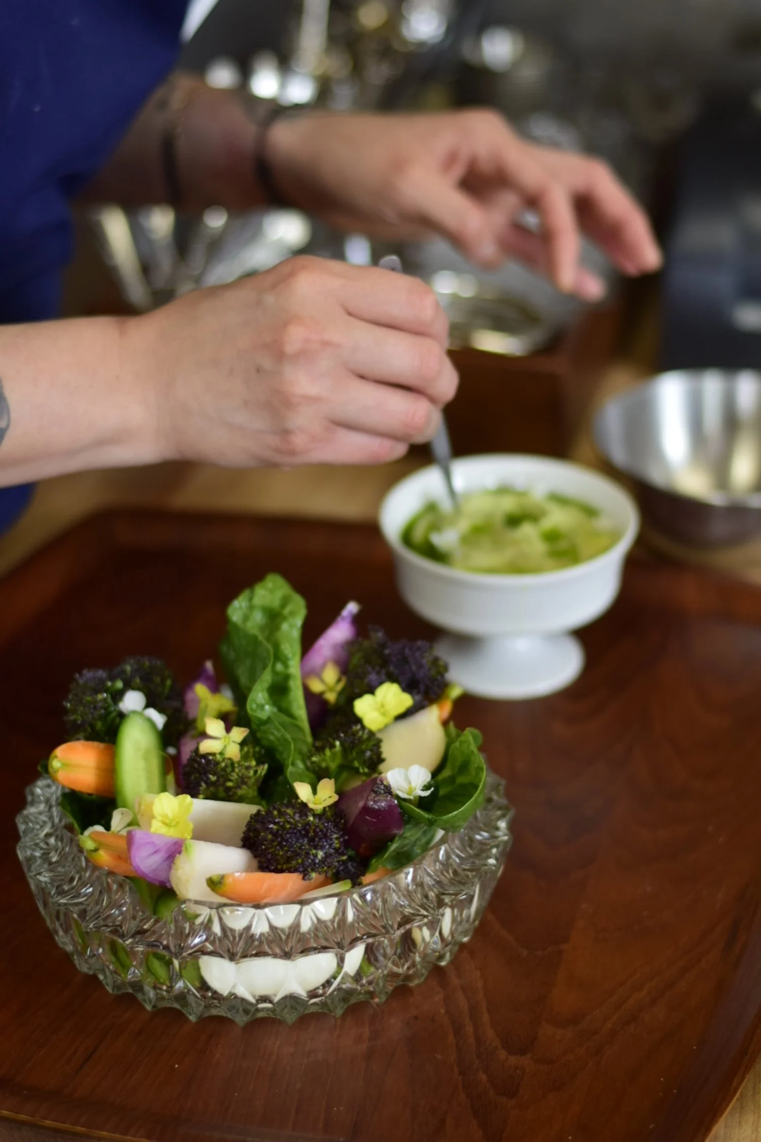 Person preparing a salad with fresh vegetables and edible flowers in a glass bowl, on a wooden table.