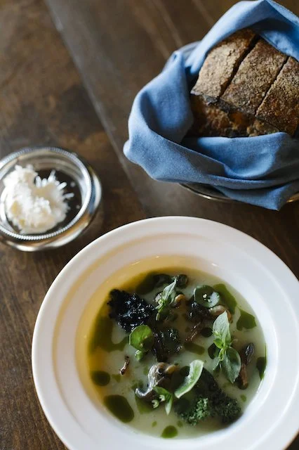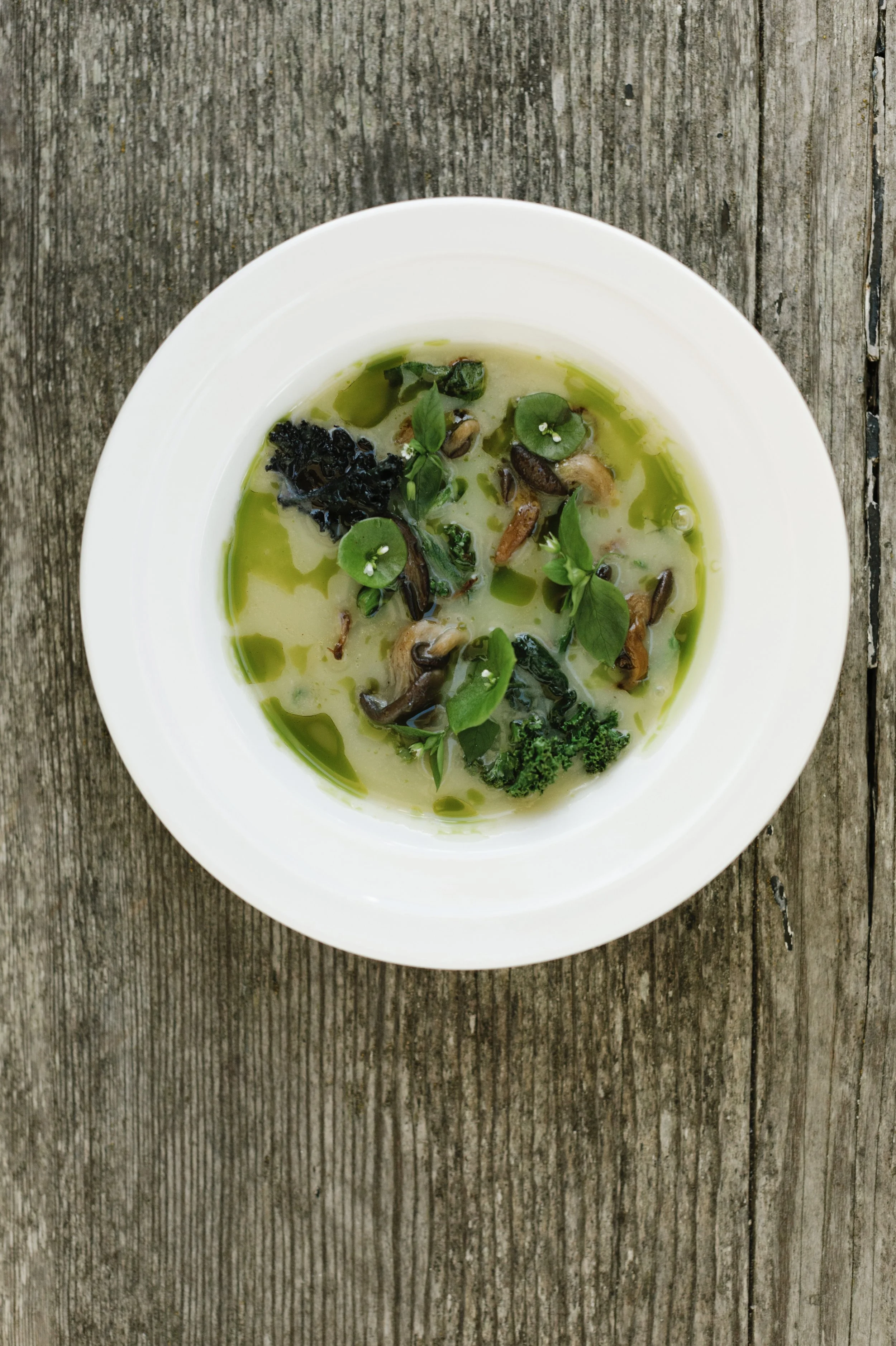 A bowl of greenish broth with herbs, mushrooms, and black caviar on a wooden table.