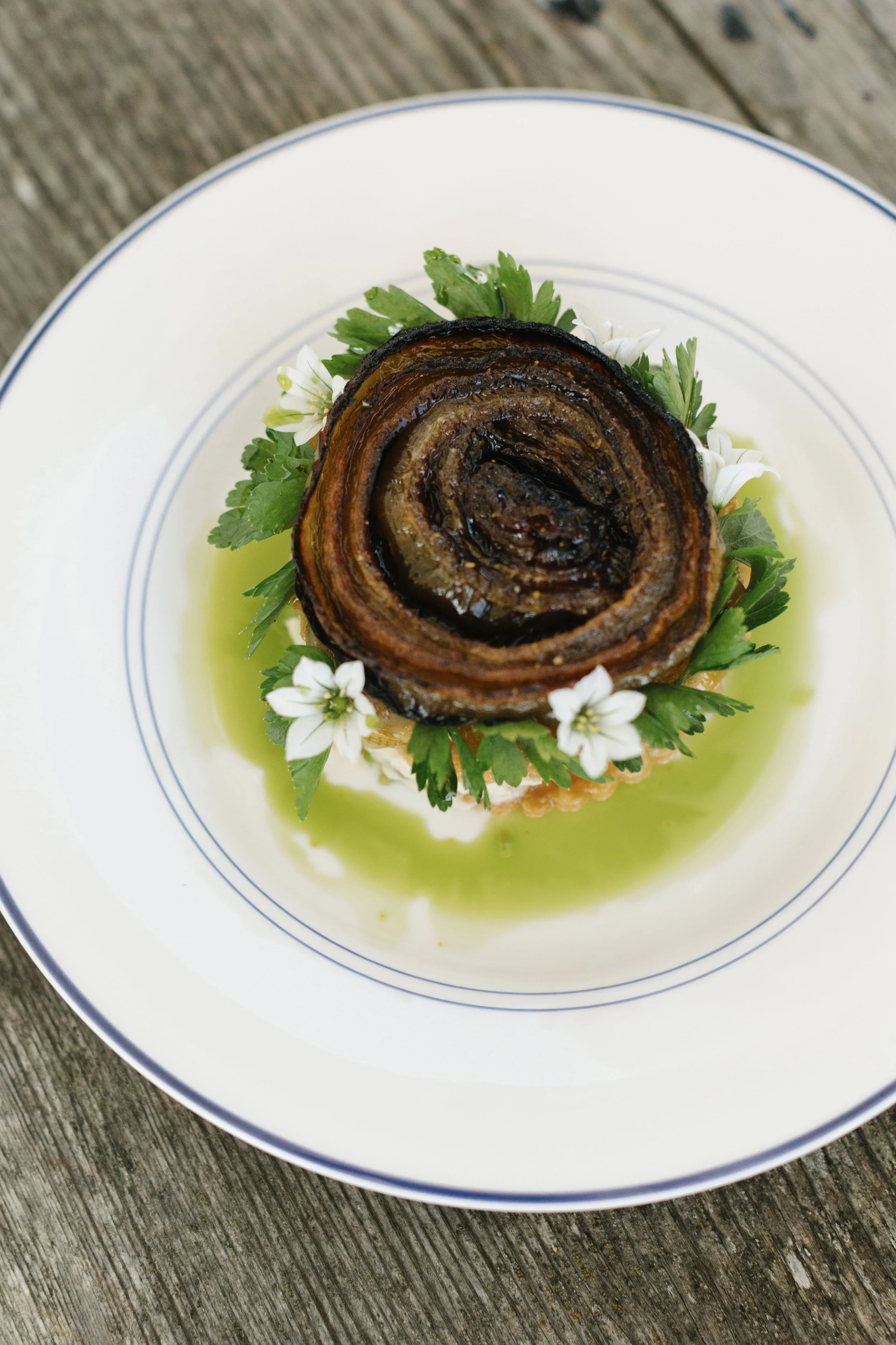A plated gourmet dish featuring a spiral-shaped, cooked eel on a bed of herbs and small white flowers, with a green sauce underneath.
