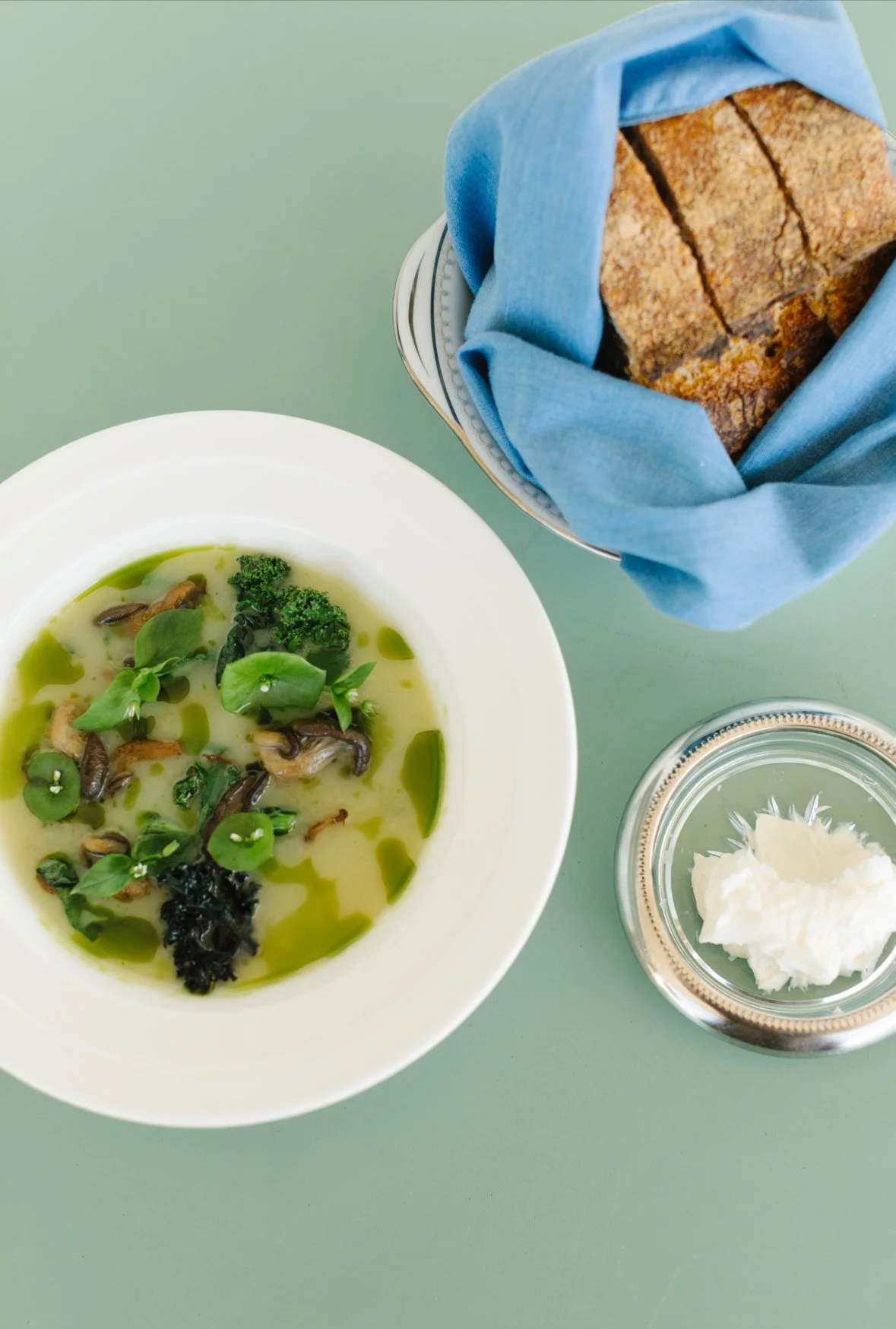 A bowl of soup with greens and mushrooms, a piece of bread wrapped in blue cloth, and a small glass container of white spread on a green table.