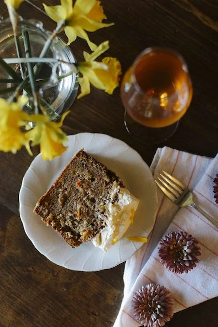 A slice of carrot cake with cream cheese frosting on a white plate, a glass of amber-colored beverage, a fork, and a floral napkin on a dark wooden table, with yellow flowers in a glass jar