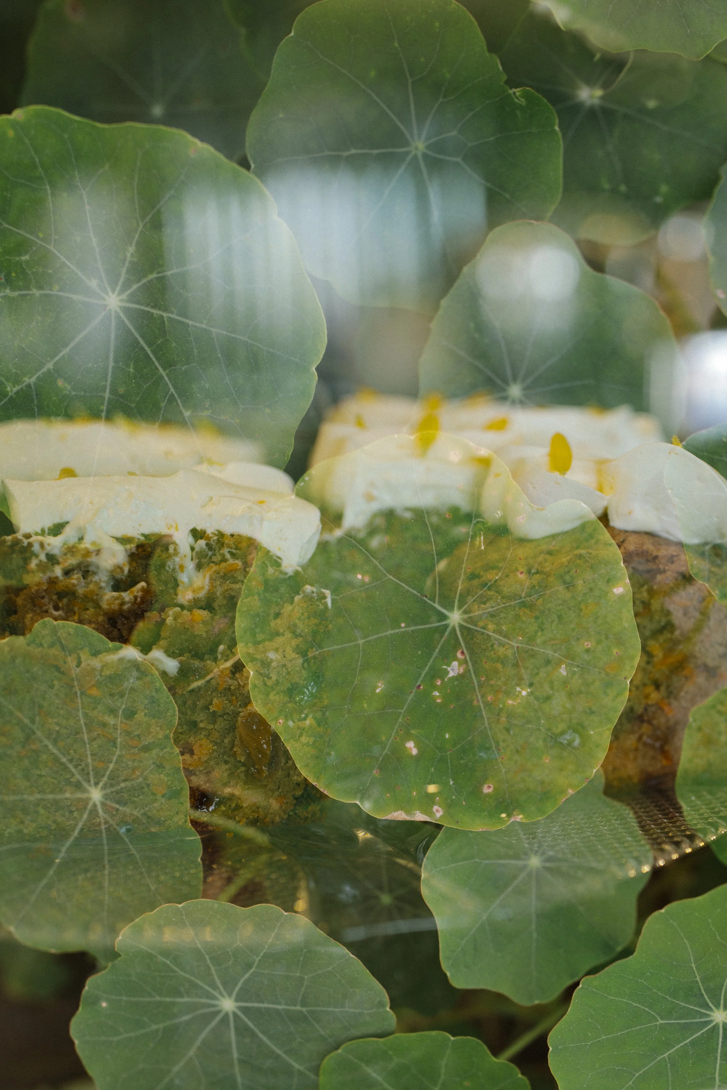 Close-up of a dessert with cream and nut topping surrounded by green leaves.